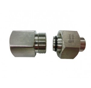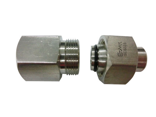LIGHT METRIC (24 DEGREE CONE SEAT) MALE X NPT FEMALE CONNECTED WITH LIGHT METRIC (24 DEGREE CONE SEAT) FEMALE SWIVEL X WELDING FITTING WITH RING NUT